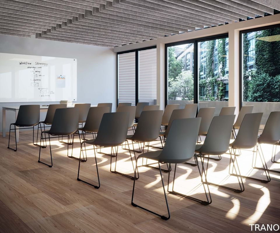 Ceiling sound baffles are an effective and inexpensive acoustic ceiling treatment that suspends down vertically to increase speech intelligibility and sound clarity. Our acoustic baffles are an excellent choice for use in spaces that are large, have limited wall space, or need materials out of reach. Since the product installs vertically, both sides have exposure to sound. With an increase in surface area, there is an increase in its ability to reduce reverberation.